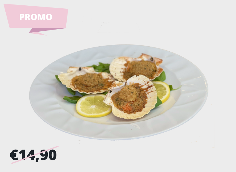 Le nostre capesante gratinate sono la scelta perfetta per chi desidera un antipasto di mare raffinato e saporito, pronto in pochi minuti. Selezioniamo solo le migliori capesante, lavorate con cura e ricoperte da una panatura croccante e aromatica, che esalta il sapore delicato del mollusco.